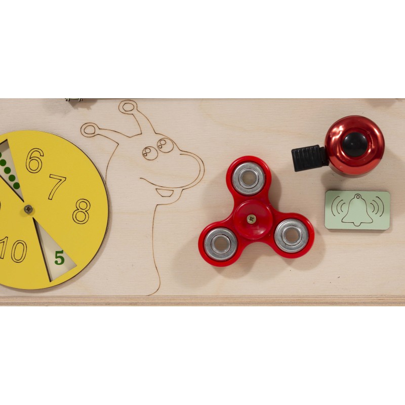 Tablica manipulacyjna w kształcie autobusu. Posiada liczne elementy, które maluch może otwierać, przesuwać czy przekręcać. Gwarantuje rozwój zdolności manualnych i intelektualnych, a także fantastyczną zabawę. Tworzywo: drewno. Wymiary: 40 x 26,5 cm.