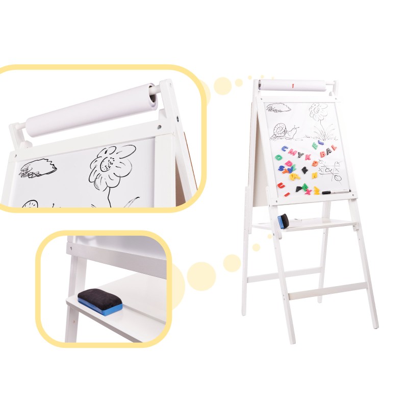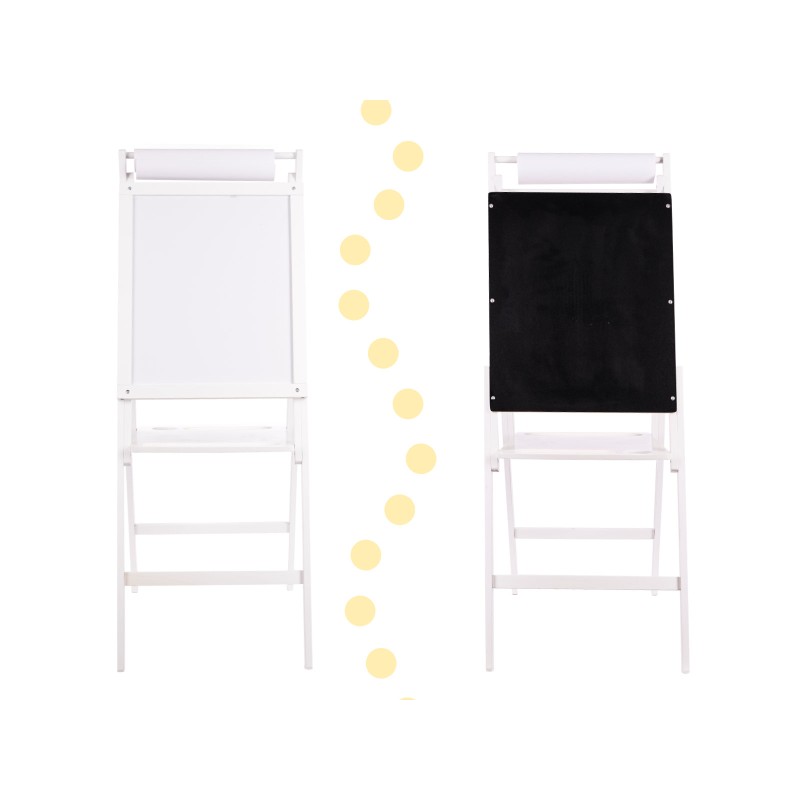 • Dwustronna tablica z akcesoriami - połączenie czarnej tablicy kredowej i białej tablicy w jednym, spójnym systemie, uzupełnionym o kredy, mazak, gąbkę oraz papier do twórczej nauki i zabawy