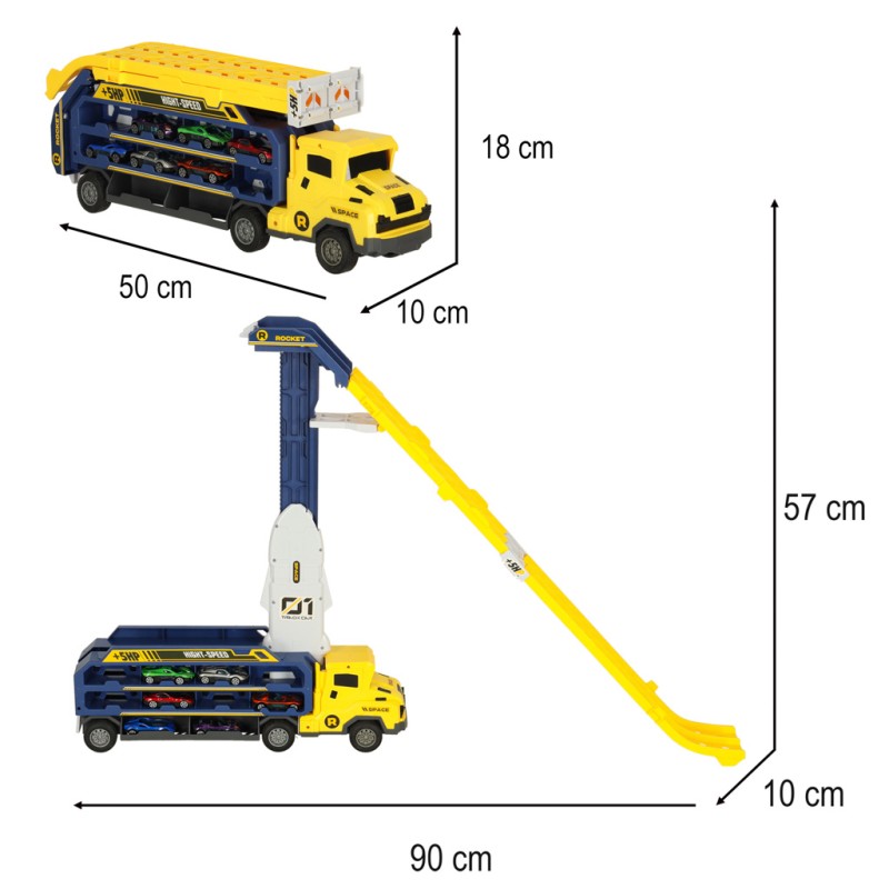 Ten wielofunkcyjny pojazd nie tylko przewozi aż sześć stylowych samochodzików, ale także skrywa w sobie niespodziankę – dwutorowy tor wyścigowy, który po rozłożeniu osiąga wysokość aż 57 cm!