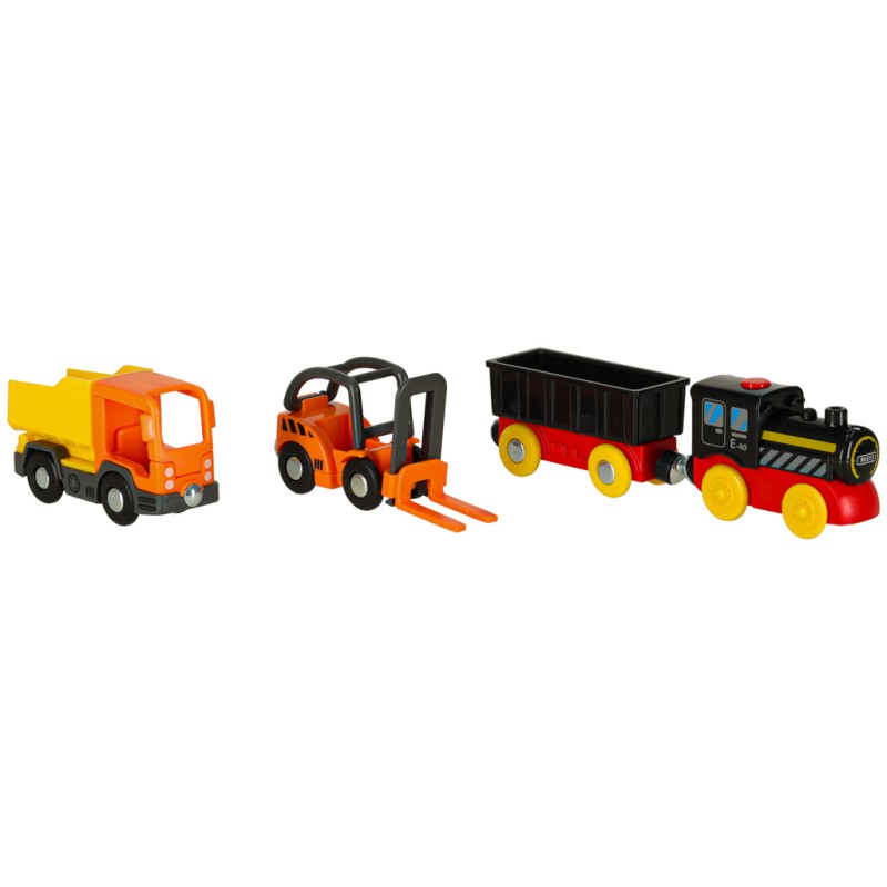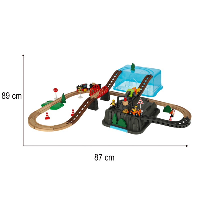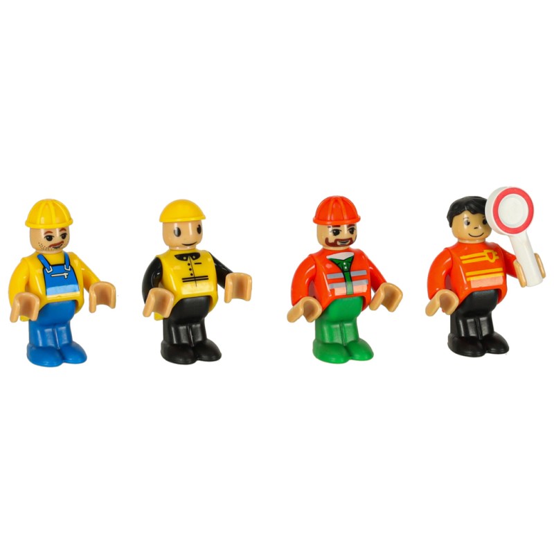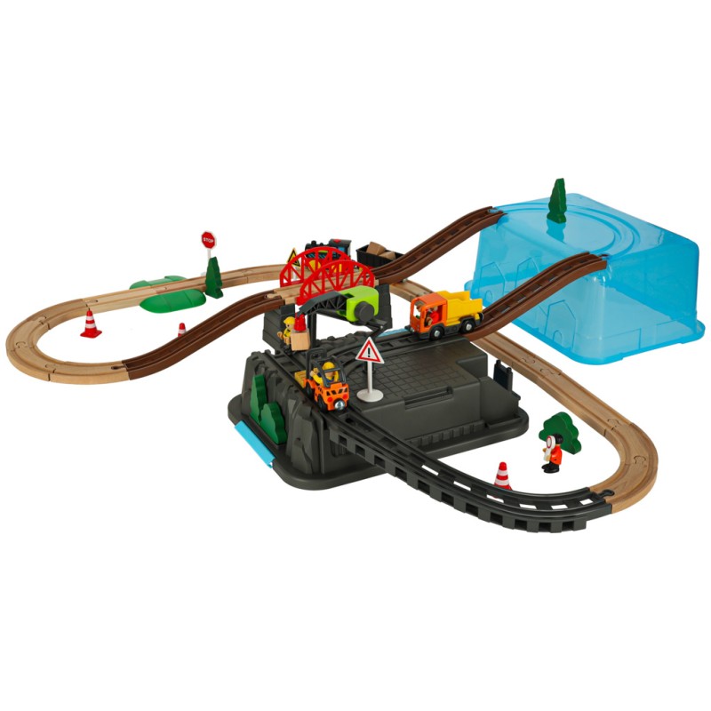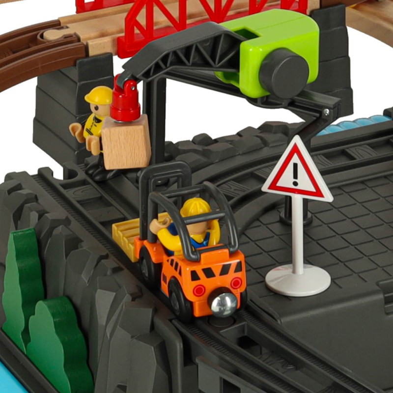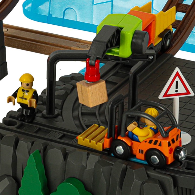 Na jednym pagórku znajduje się dźwig, który pomaga w rozładowaniu lub załadowaniu ładunku z pociągu – scenariusz zabawy zależy od wyobraźni dziecka. Akcesoria takie jak znaki drogowe, pachołki, drzewka i figurki pozwalają na uzupełnienie scenerii wokół zbudowanego toru.