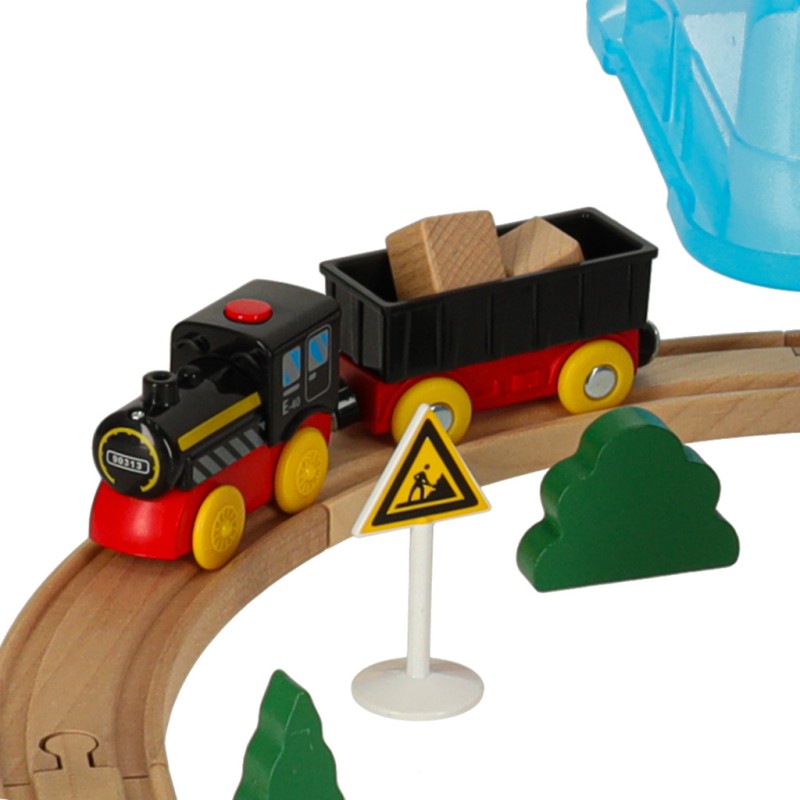 duży tor z samojeżdżącym pociągiem – drewniany pociąg porusza się samodzielnie po torze, dzięki czemu dziecko może obserwować, jak pojazd przemierza trasę, co rozwija jego ciekawość i zmysł wzroku