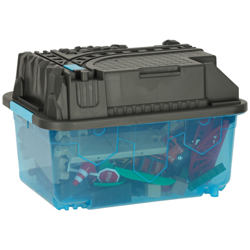 Zestaw jest zapakowany w solidne plastikowe pudełko, które pełni również funkcję elementu toru. Po skończonej zabawie pudełko pozwala na przechowywanie wszystkich elementów w jednym miejscu, co ułatwia organizację i oszczędza miejsce w pokoju dziecka.