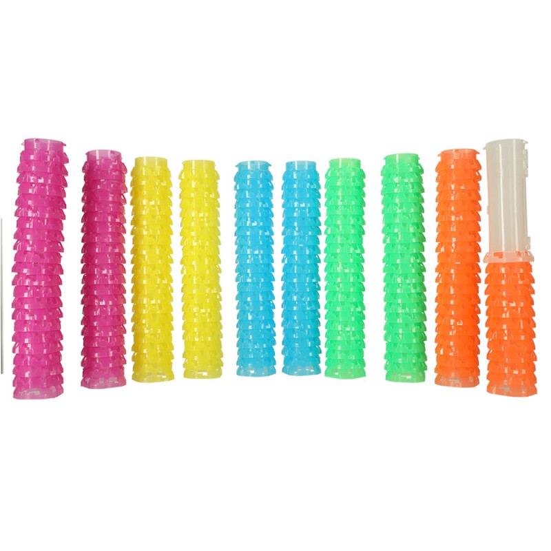 Klocki są w pięciu kolorach – żółtym, różowym, zielonym, niebieskim i pomarańczowym. Umożliwia to stworzenie ciekawego i niezwykle kolorowego toru do zabawy!