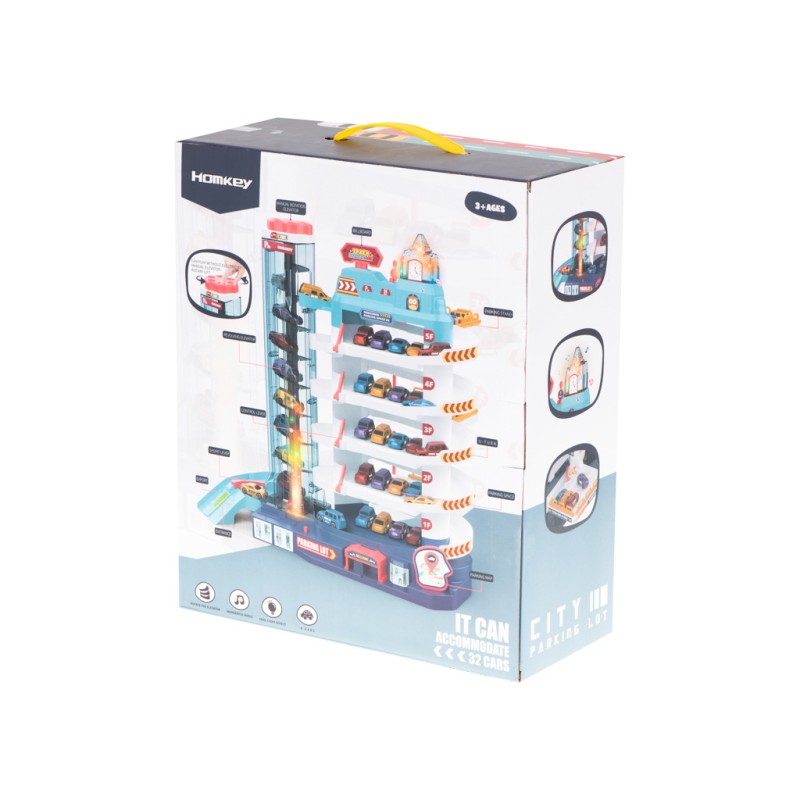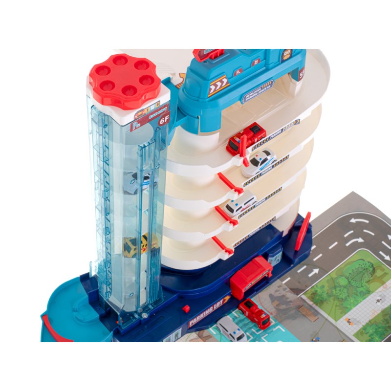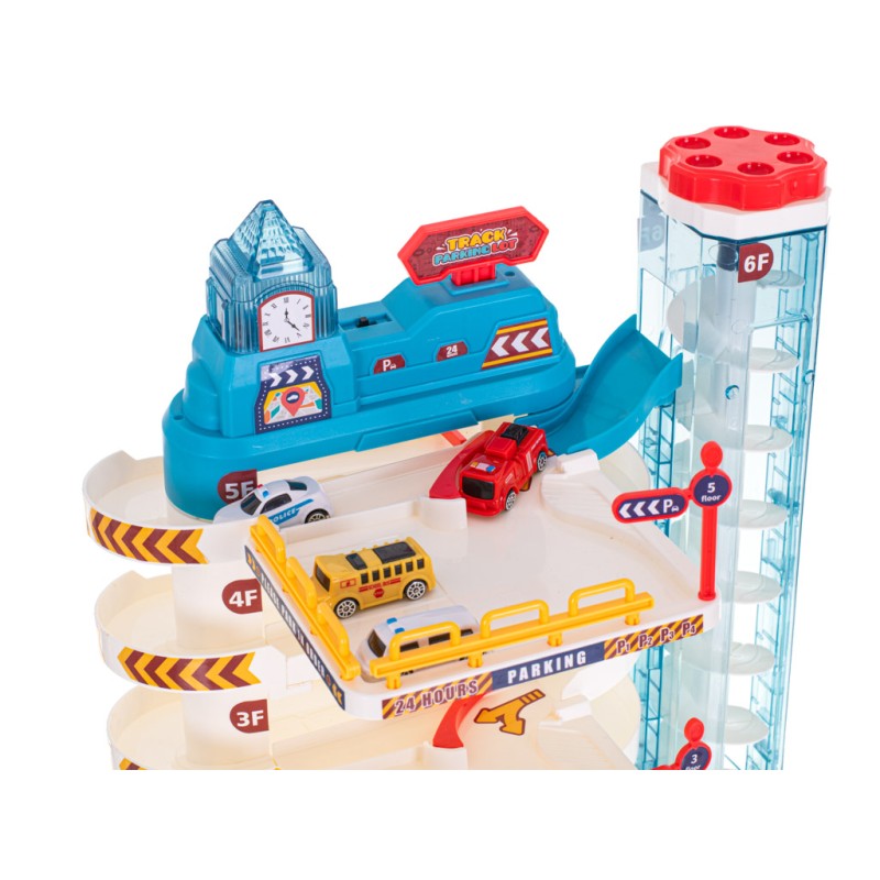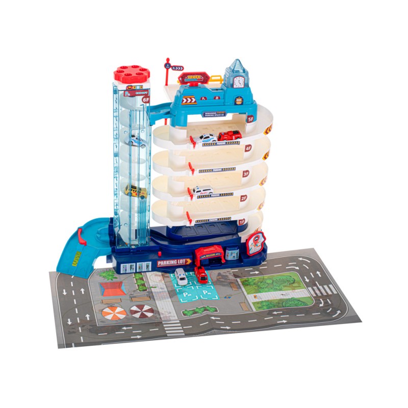 Parking ma aż 5 poziomów, przeznaczonych do parkowania samochodzików, które znajdziesz w zestawie. Na samą górę auta dostaną się za pomocą automatycznej windy.