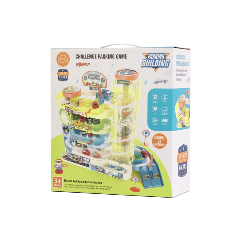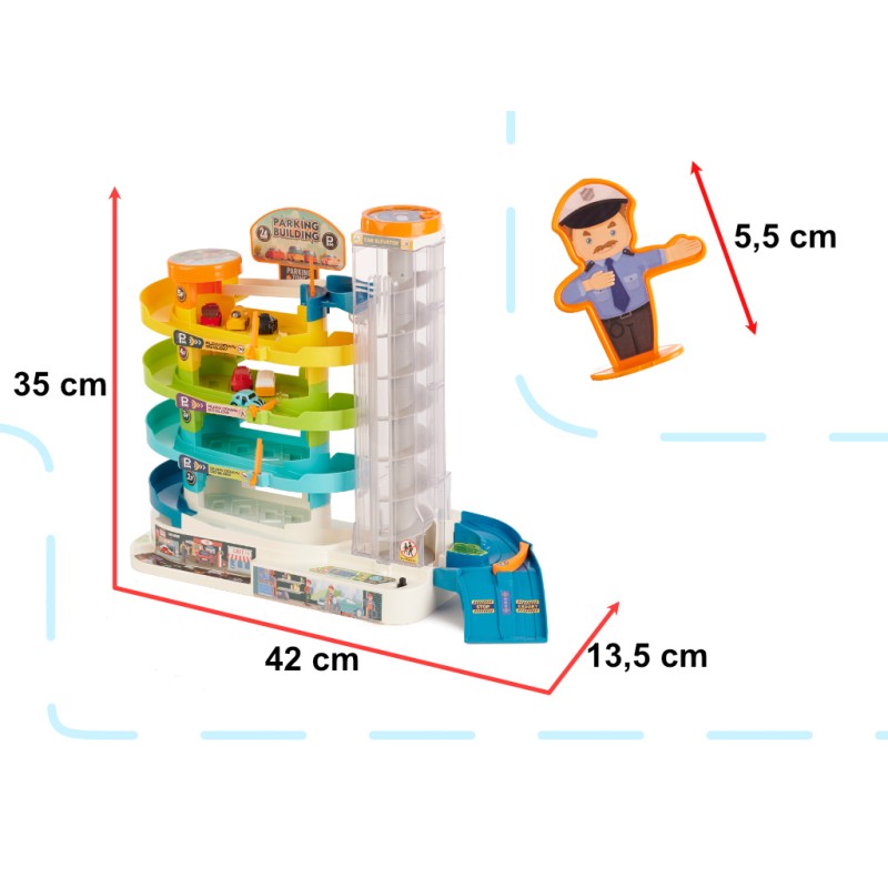 Parking ma aż 4 poziomy, przeznaczone do parkowania samochodzików, które znajdziesz w zestawie. Na samą górę auta dostaną się za pomocą automatycznej windy.