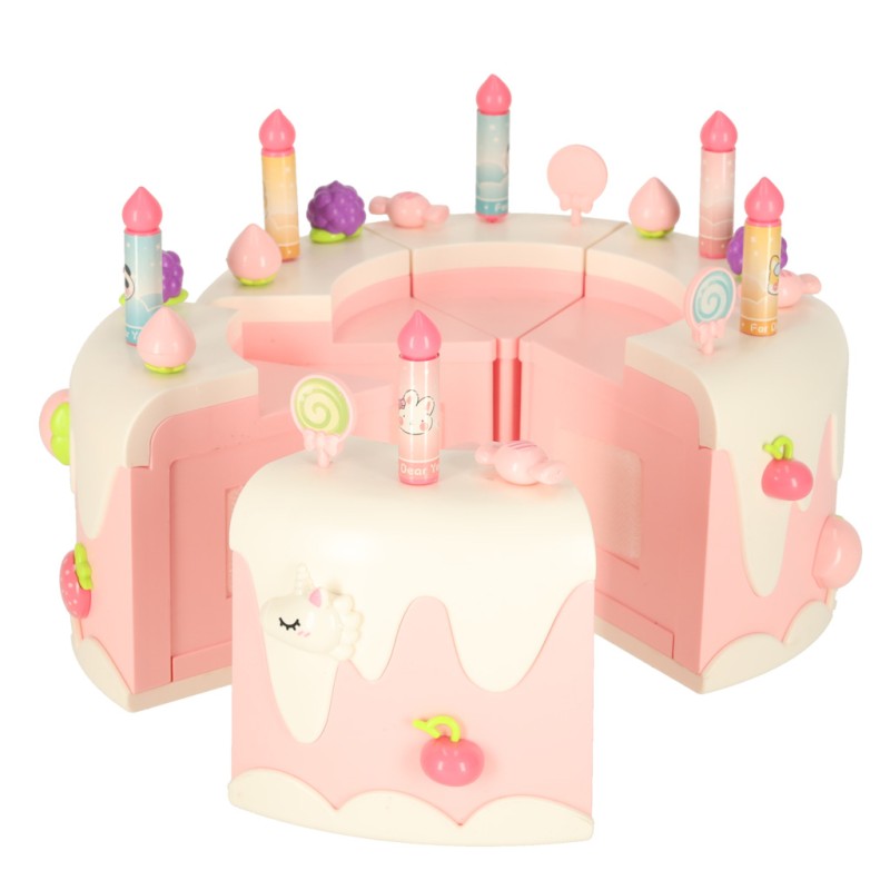 Dwupiętrowy zabawkowy tort możesz podarować dziecku na urodziny. Po włożeniu baterii tort gra trzy wesołe melodyjki. Tort zawiera także ukrytą niespodziankę – po naciśnięciu figurki misia lub jednorożca tort obraca się, grając specjalną piosenkę.