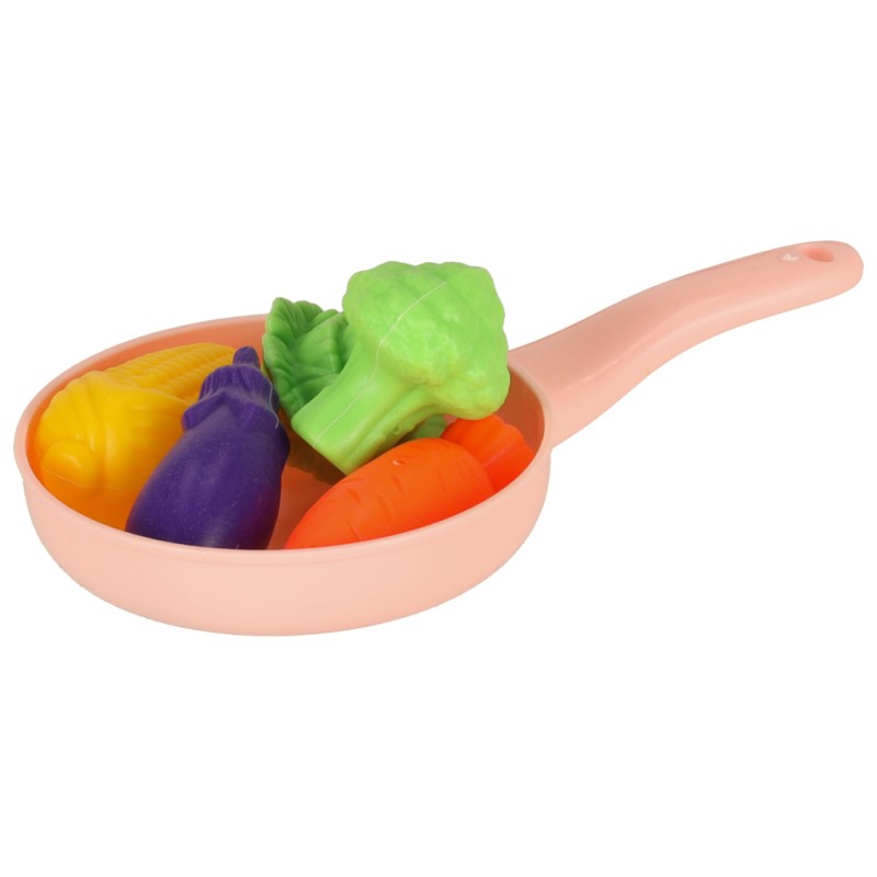 Zestaw zabawkowych warzyw i owoców do krojenia z zastawą i kuchenką. Elementy kompletu są zapakowane do koszyka - warzywa i owoce mają łączone segmenty na rzepy, które można przekrajać. Wymiary opakowania: 29 cm x 20 cm x 13,5 cm