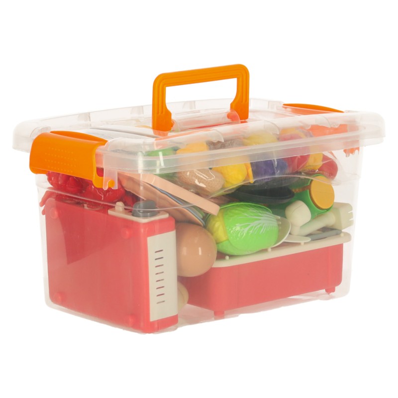 54-elementowniy zestaw – do zabawy dziecko ma różnorodne owoce i warzywa, a także akcesoria kuchenne, takie jak talerze, zlew kuchennych i kuchenka