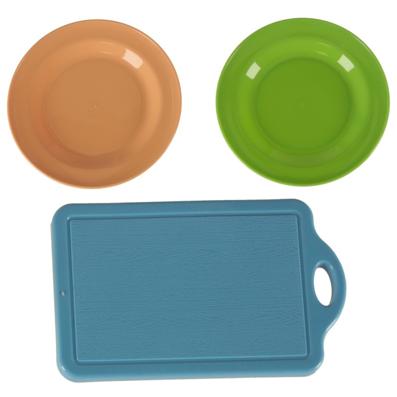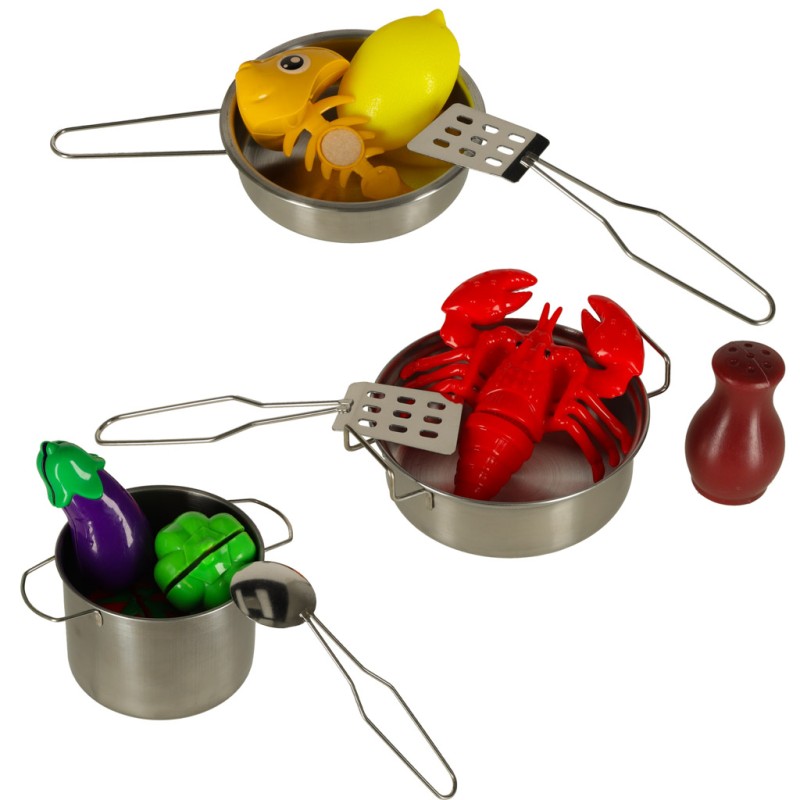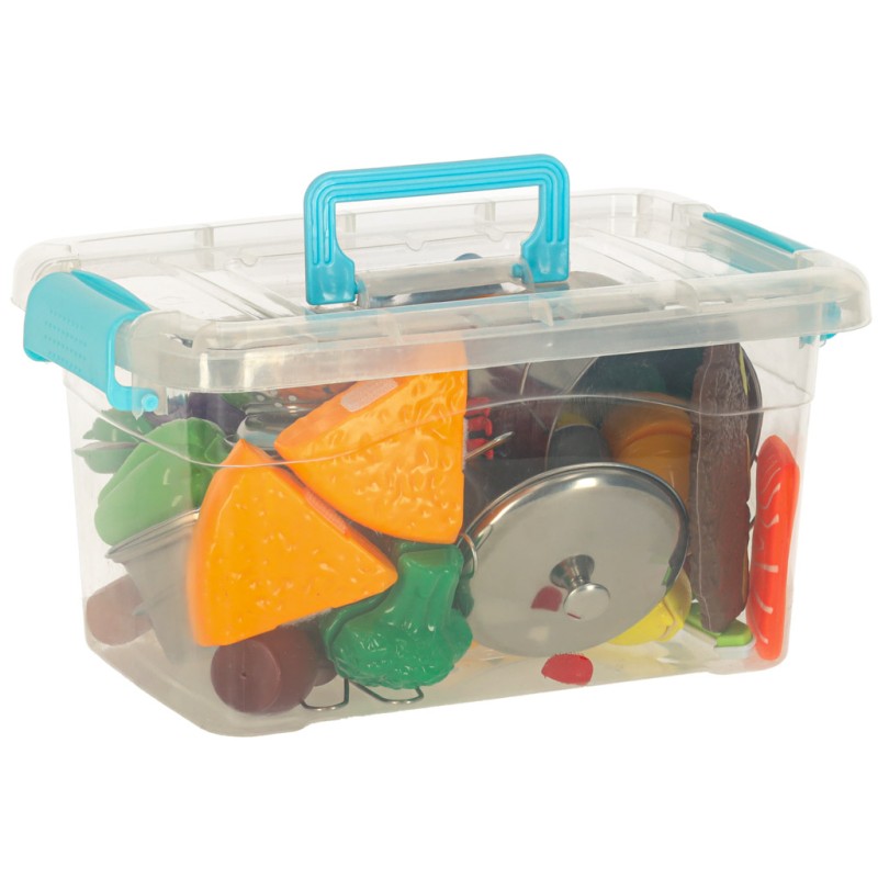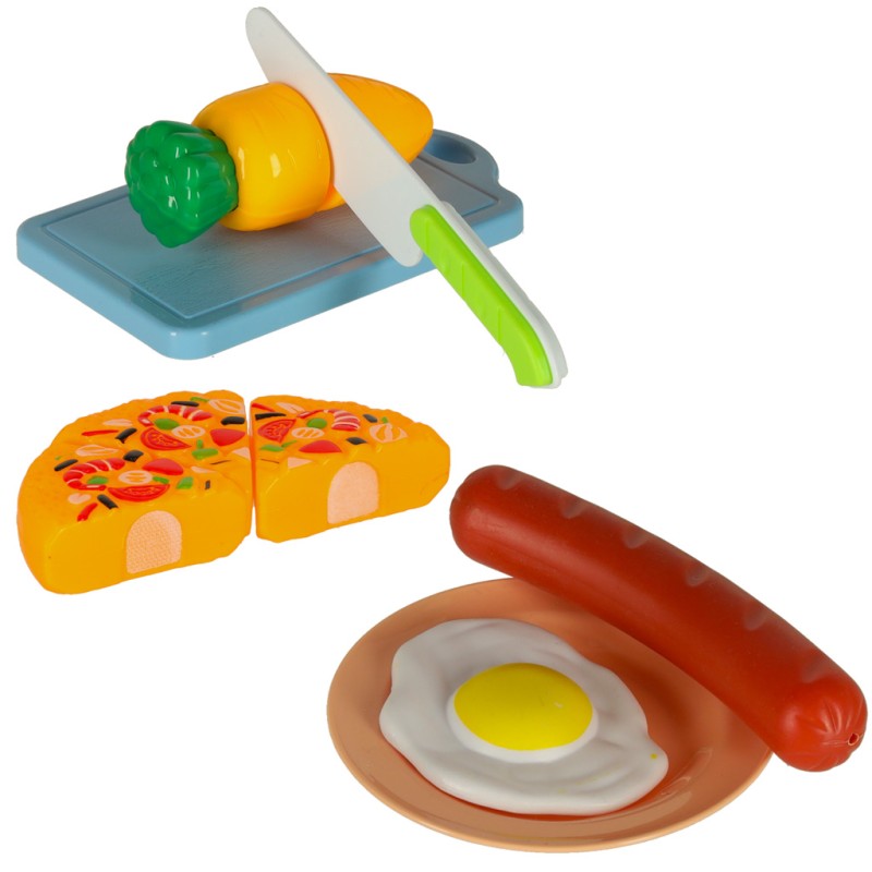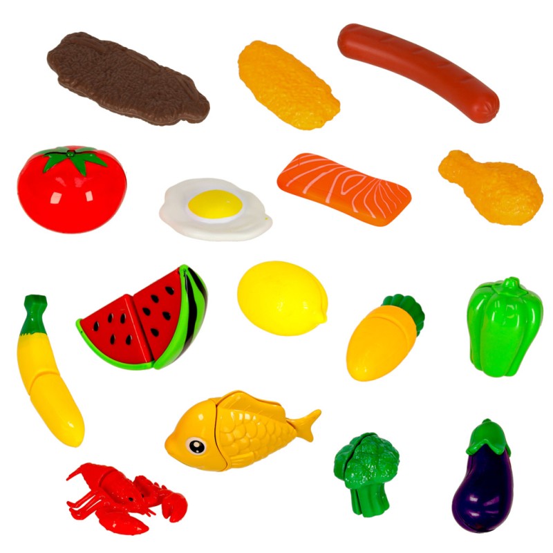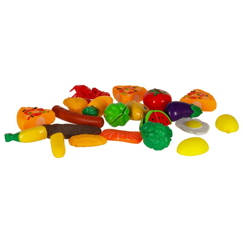 Różnorodne warzywa, owoce i inne produkty spożywcze rozdzielają się na mniejsze części, co sprawia, że maluch może ćwiczyć swoje zdolności manualne, „krojąc” produkty przy pomocy plastikowego noża. W zestawie znajdują się również talerze, durszlak, a także inne akcesoria kuchenne, które dodają zabawie realizmu.