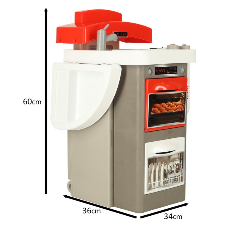 Nowoczesna kuchnia plastikowam z akcesoriami. Zabawka jest miniaturą prawdziwej kuchni, posiada piekarnik, zmywarkę, ekspres do kawy i wiele więcej. Dzięki funkcji składania zabawka zajmie mało miejsce. Wym. prod. 65x36x93cm (po złożeniu 34x36x60).