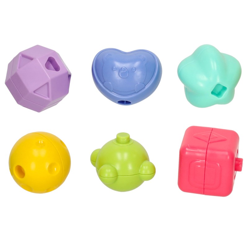 Piłeczki i klocki sensoryczne wykonane z miękkiego silikonu. Zestaw zapewni wszechstronną zabawę pełną rozrywki, nauki i rozwoju. Na klockach znajdują się różne wzory oraz liczby. Wiek: 6m+. Klocek: 5 cm x 5 cm x 6 cm. Kulka: 6 cm.