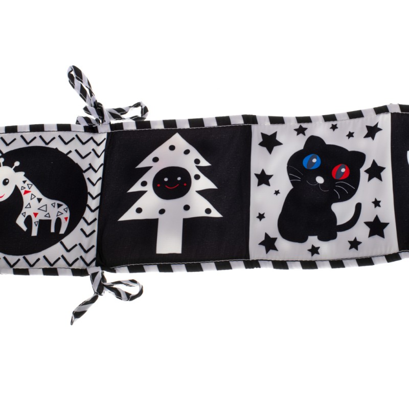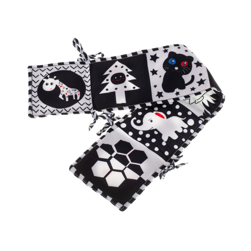 Książeczka w kształcie harmonijki świetnie sprawdzi się w roli maty ochronnej do łóżeczka. Za pomocą sznureczków przymocujesz ją do szczebelków.