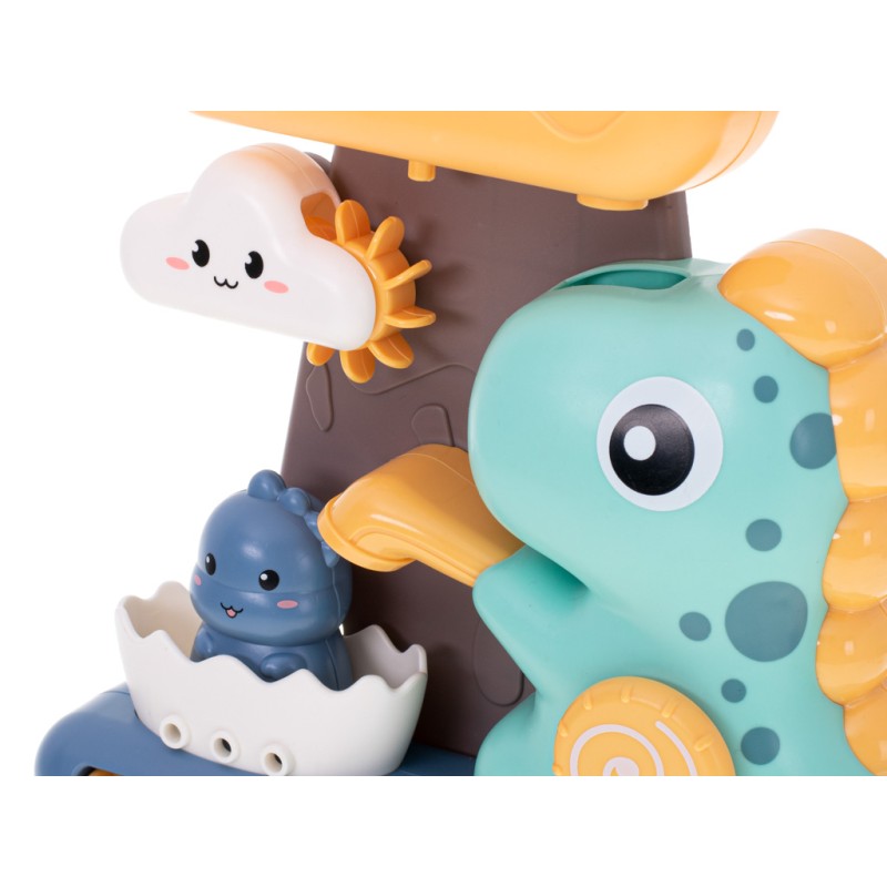 Bohaterami zabawki są dwa kolorowe dinozaury i uśmiechnięta chmurka, które sprawią, że każda kąpiel stanie się czystą przyjemnością.