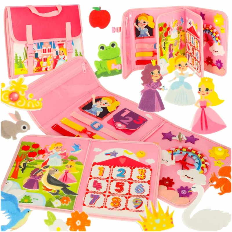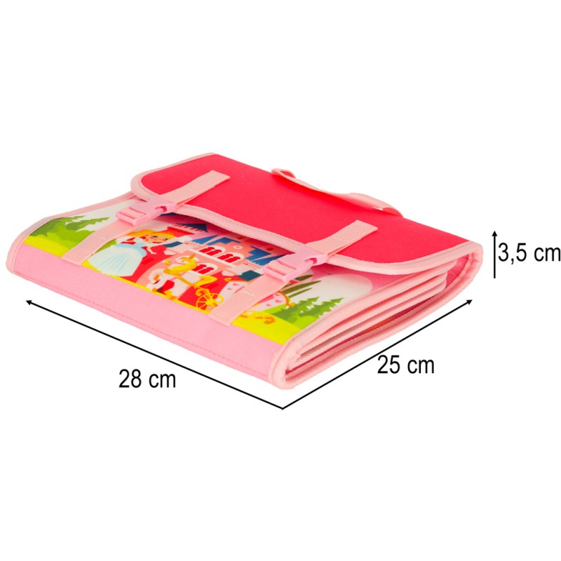 Filcowa tablica manipulacyjna w kształcie plecaka-walizki z bajkowym motywem księżniczki. Służy między innymi do nauki liczenia i poznawania kształtów. Ma ruchome elementy ćwiczące zdolności manualne. Wymiary: 28 cm x 25 cm x 3,5 cm, kolor: różowy