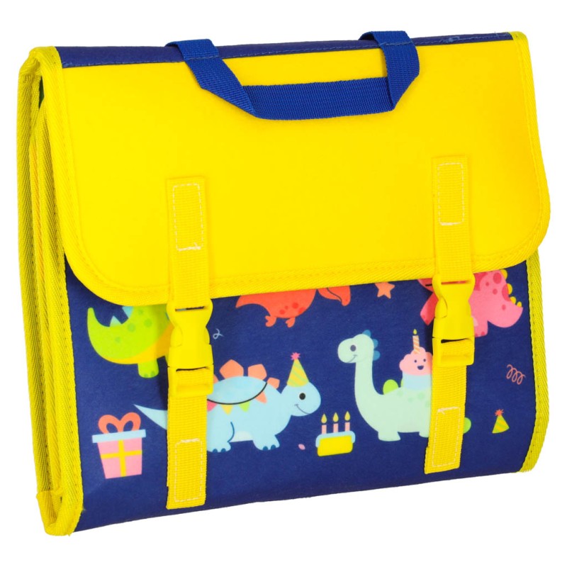 Kolorowa filcowa tablica z dinozaurami wygląda jak klasyczny tornister. Ergonomiczny kształt oraz szelki umożliwiają wygodny transport do szkoły lub świetlicy. Korzystanie z tablicy pozwala na komfortowe przyswajanie i utrwalanie wiedzy metodą nauki poprzez zabawę.