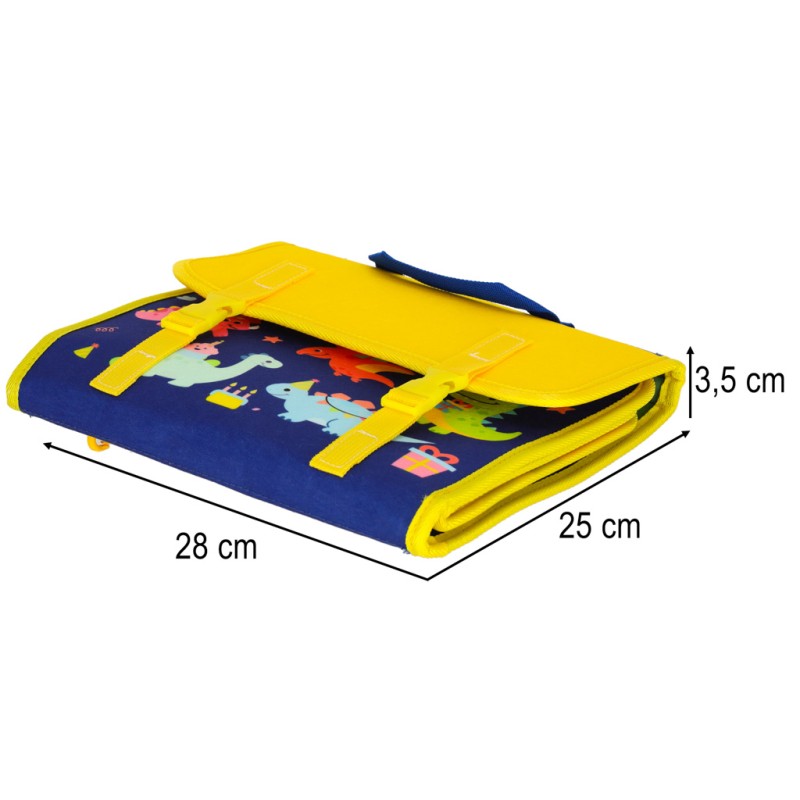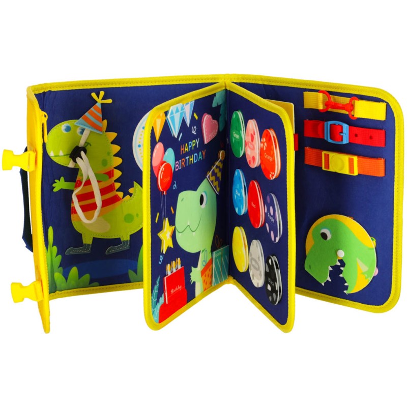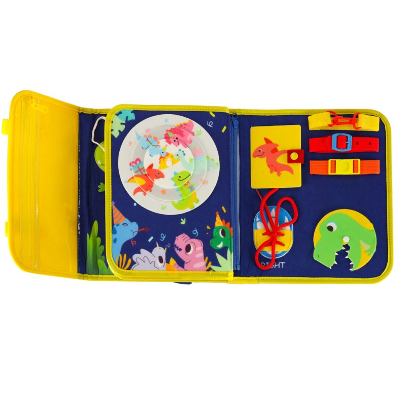 Tablica manipulacyjna Montessori w formie teczki (filc, 28×22×3,5 cm, po rozłożeniu 45 cm), z elementami motorycznymi (zamki, guziki, klamry), edukacyjnymi (litery, cyfry, dinozaury) i kreatywnymi (tablica suchościeralna, 4 markery). Dla dzieci 3+.