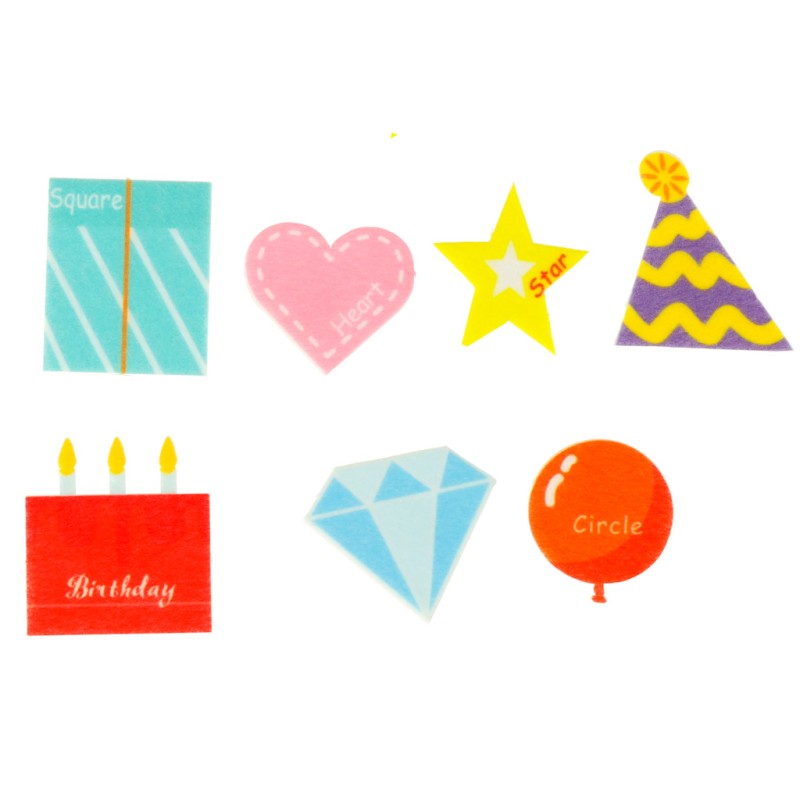 Wyklejanki: serce, balony, gwiazdka, tort, prezent, stożkowa czapeczka urodzinowa, dinozaur