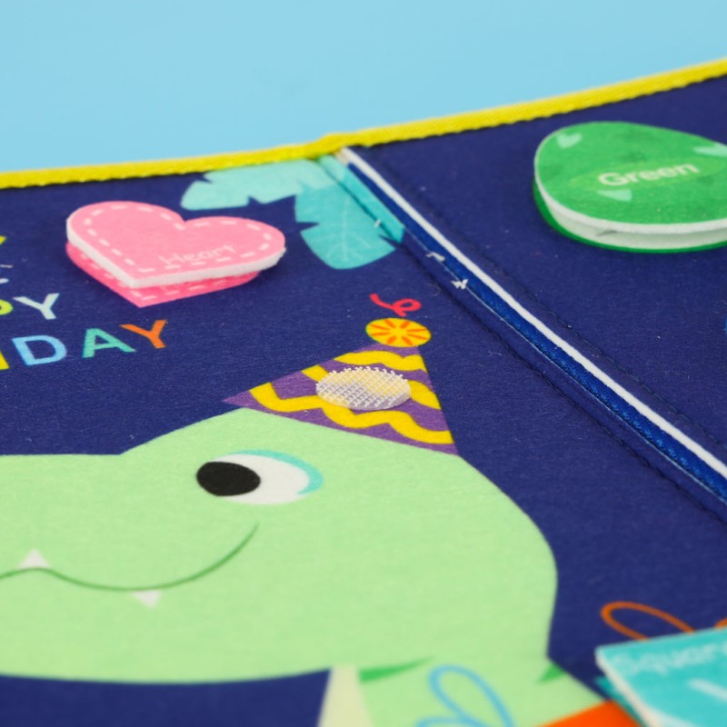 Sensoryczna tablica manipulacyjna z motywem dinozaurów ma w sobie elementy, które przydadzą się do nauki języka obcego, kształtów, kolorów oraz cyfr. Część elementów tablicy posiada napisy w języku angielskim, umożliwiając dziecku przyswajanie oraz utrwalanie słownictwa.