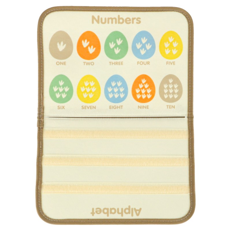 • Elementy edukacyjne: karty i plansze z literami, cyframi, kolorami, kształtami oraz dinozaurami w języku angielskim - idealne do nauki przez zabawę