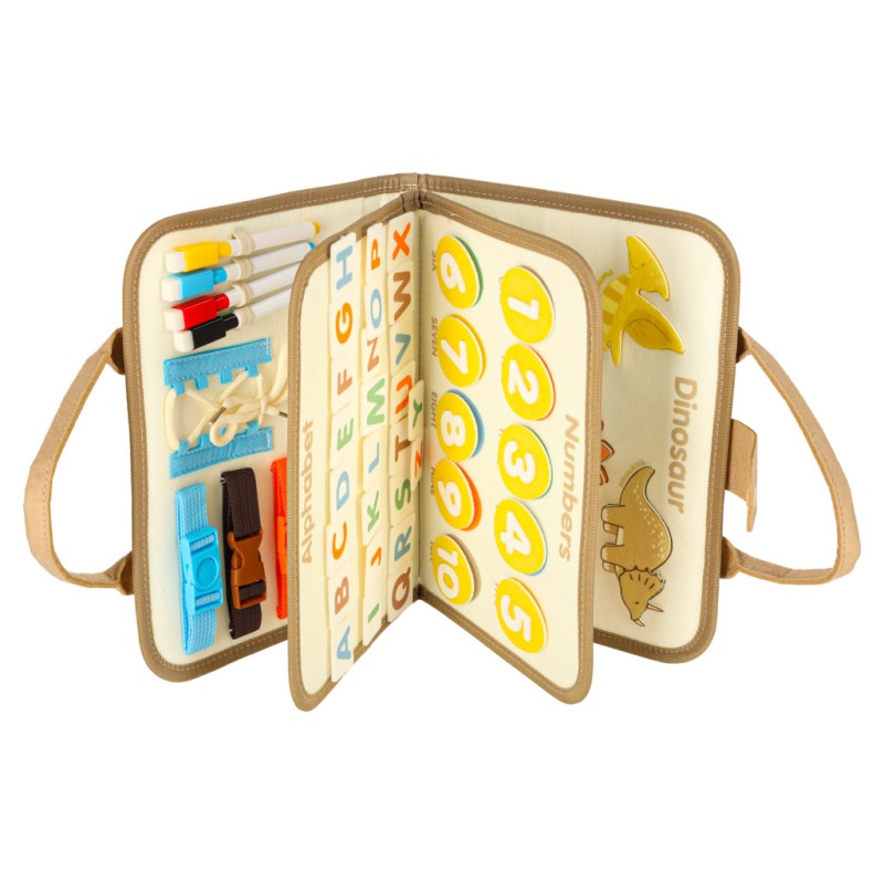 Motyw z dinozaurami czyni tę tablicę atrakcyjną dla dzieci, a pastelowe kolory i solidne wykonanie - idealną dla rodziców. Dziecko ma do dyspozycji zestaw edukacyjny, który bawi, uczy i stymuluje rozwój w każdej sytuacji - w przedszkolu, w domu czy na spacerze.