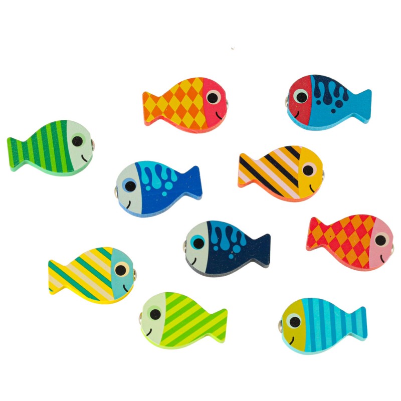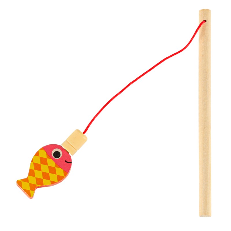 Wśród wielu elementów sortera znajdziesz kolorowe rybki z magnesami, które należy złowić, za pomocą wędki również wyposażonej w magnes.