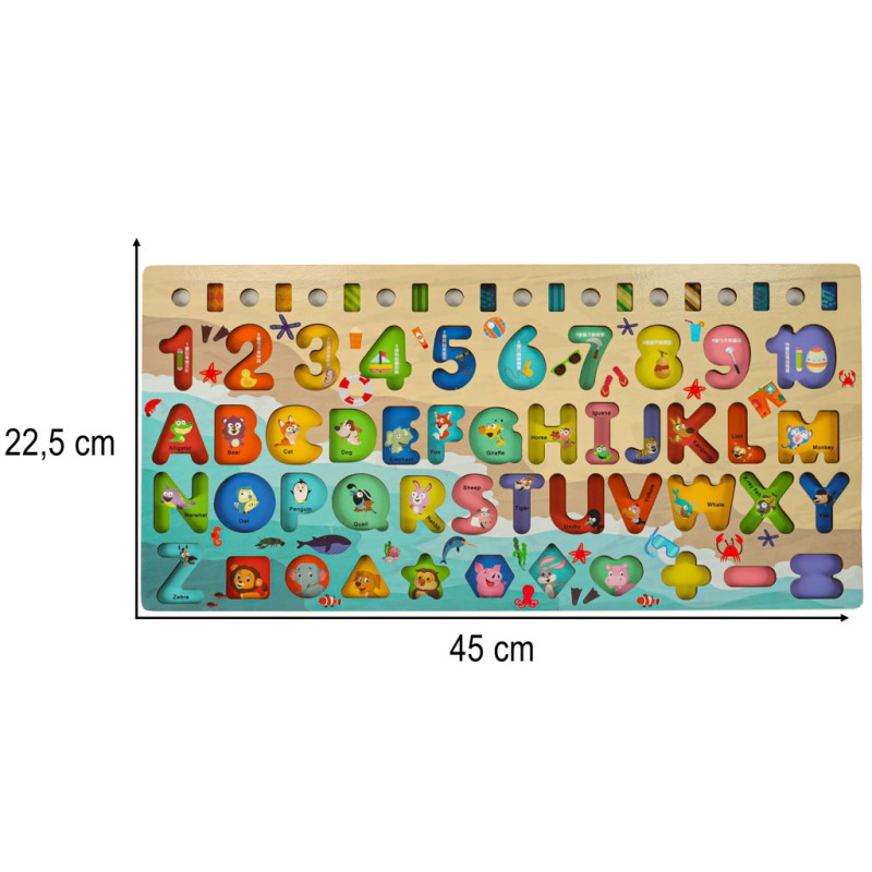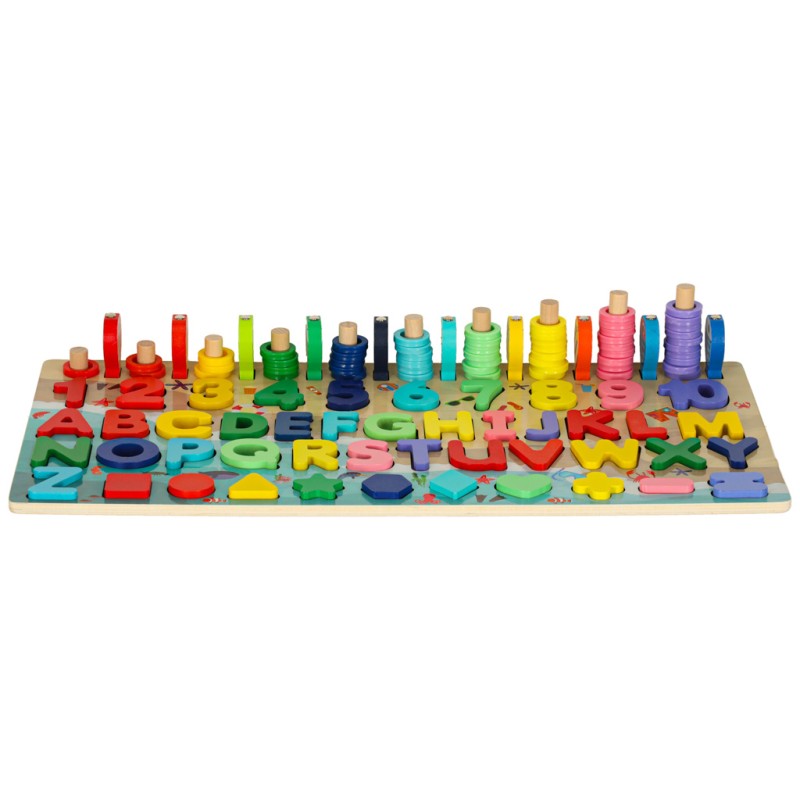 Ciekawy drewniany sorter edukacyjny z liczydłem. Podstawa sortera składa się z miejsc na kolorowe cyferki i różne figury geometryczne. Dodatkowo posiada patyczki umożliwiające układanie krążków. Nauka i zabawa w jednym. Wymiary: 35,5x13x0,6cm.