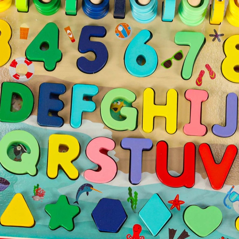 Do zestawu dołączono kolorowe figury geometryczne i cyferki, które należy dopasować do odpowiednich otworów. Zabawa nauczy dziecko rozpoznawania kształtów i dodatkowo pomoże w poznaniu cyferek i literek.
