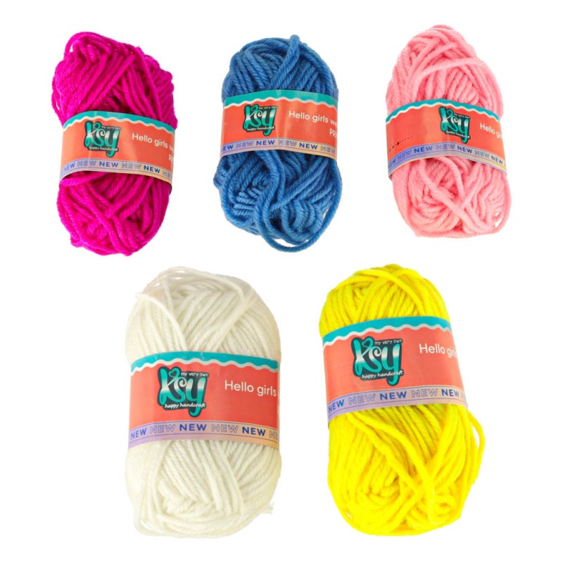 • 5 × kolorowe włóczki: różowa, żółta, fioletowa, biała i niebieska