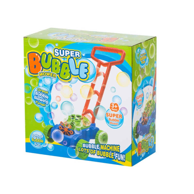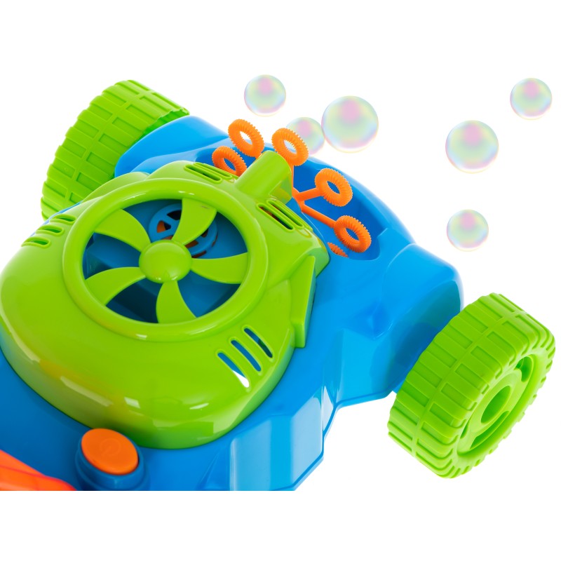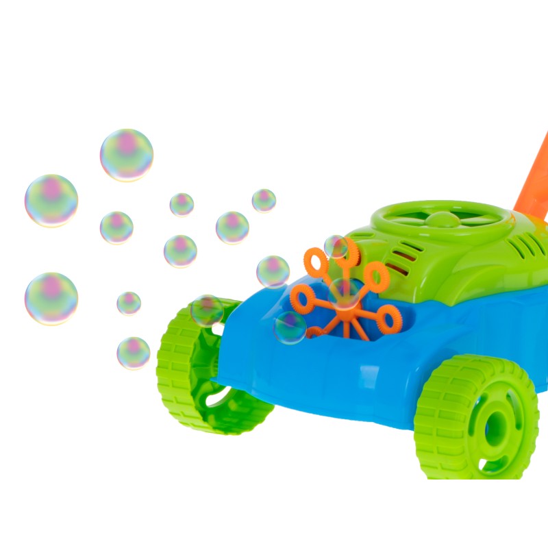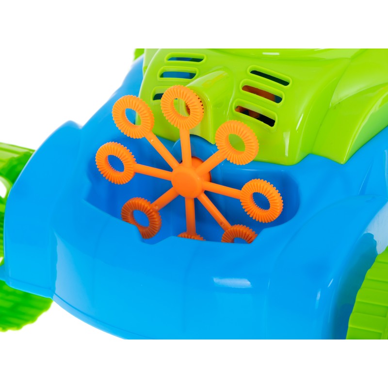 Kosiarka została wyposażona w 8 pierścieni, które podczas prowadzenia zabawki zanurzają się w płynie, a mały wiatraczek powodujący delikatny podmuch sprawia, że wylatują kolorowe mydlane bąbelki.