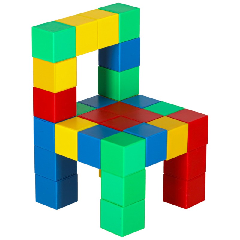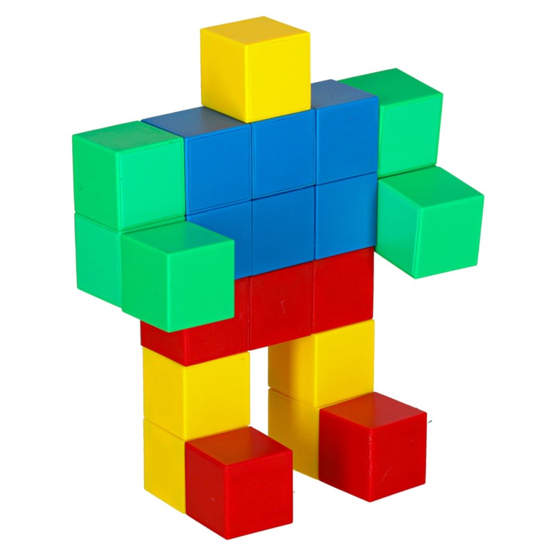 Każdy klocek ma kształt kwadratu, co pozwala dziecku swobodnie tworzyć zarówno proste, jak i bardziej złożone budowle. Klocki są w intensywnych kolorach: zielonym, żółtym, czerwonym i niebieskim, co przyciąga uwagę, zachęcając do tworzenia kolorowych projektów.