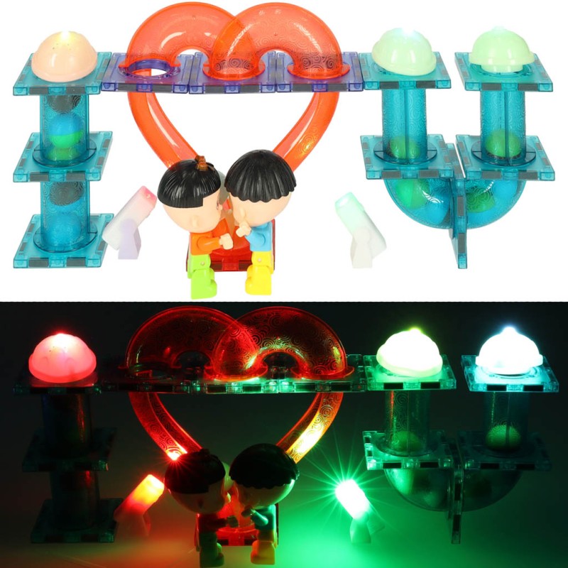 Jednak ten zestaw jest wyjątkowy – posiada wiele świecących elementów, w tym kulki, które wprawione w ruch zaczynają świecić. Dzięki temu po zbudowaniu toru, kulki przemieszczającego się przez niego będą stanowić przepiękne, świetlne widowisko!