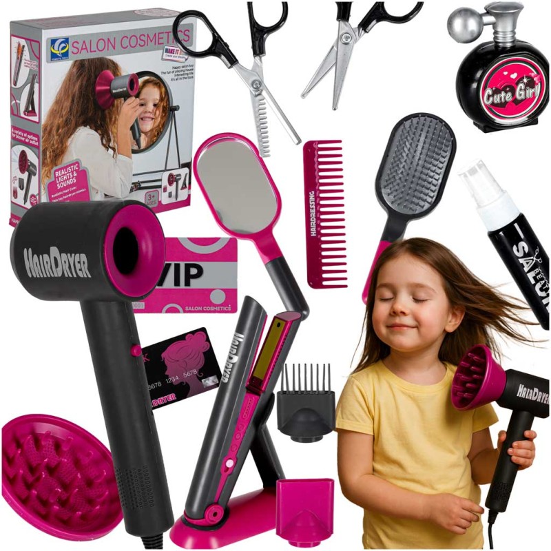 • Wszystko, czego potrzebuje mały stylista - ten kompletny zestaw fryzjerski to mini salon w pudełku - suszarka, prostownica, lusterko, szczotka, grzebień i fryzjerskie akcesoria do tworzenia wyjątkowych zakręconych stylizacji włosów