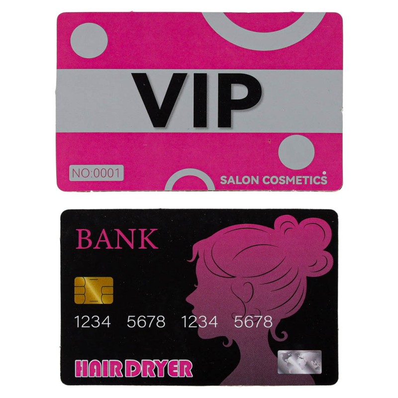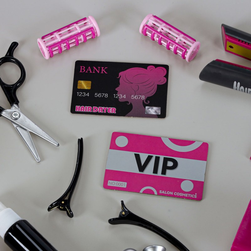 • Karta płatnicza i karta stałego klienta - tekturowe akcesoria do zabawy w mały salon