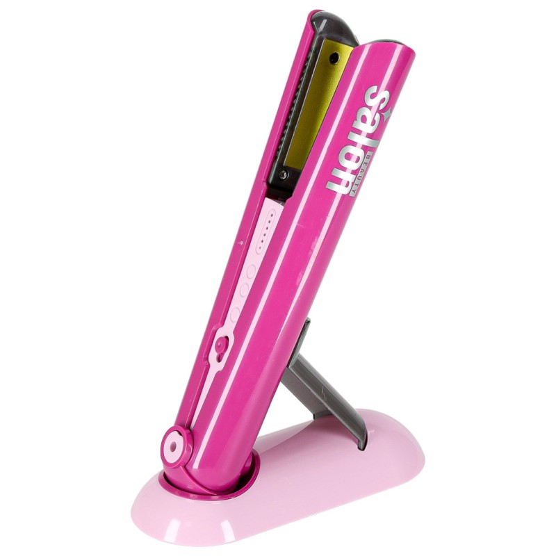 • Elementy interaktywne: tak - suszarka wydaje dźwięki jak prawdziwe urządzenie, a intensywność „suszenia” można zmienić za pomocą suwaka, prostownica po ściśnięciu zaczyna świecić oraz wydawać dźwięki
