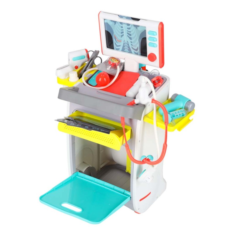 Stacja medyczna na kółkach dla dzieci jest przeznaczona dla dzieci powyżej 3. roku życia. Pozwoli pokazać najmłodszym jak wyglądają wizyty u lekarza oraz podstawowe badania medyczne. Dziecko ma do dyspozycji różnorodne akcesoria, które dodają zabawie realizmu.