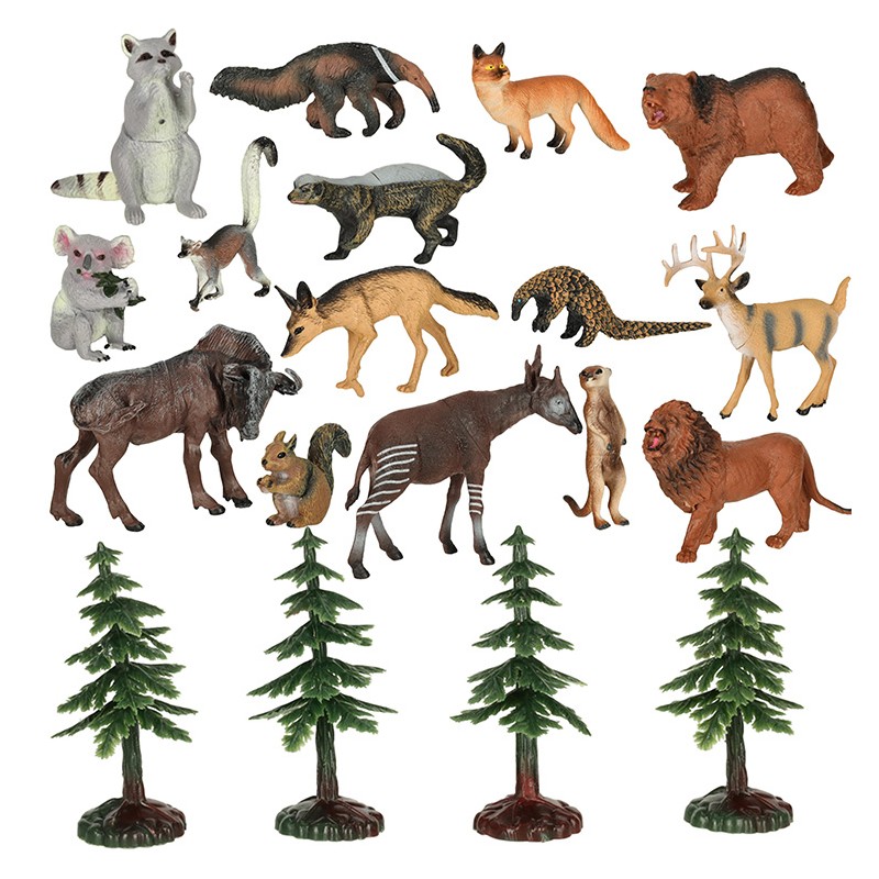 Każda z figurek została wykonana z dbałością o szczegóły, tak aby jak najlepiej odwzorowywać prawdziwe zwierzę. Maluch w zestawie znajdzie zwierzęta z sawanny, dżungli, jak i lasu. Od majestatycznego lwa po uroczą koalę – dziecko z pewnością znajdzie swojego ulubionego zwierzaka. W zestawie dodatkowo znajdują się 4 choinki, które umożliwiają stworzenie wyjątkowej leśnej scenerii.