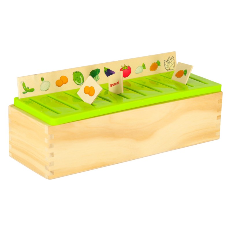 Zabawa polega na wrzuceniu w odpowiedni otwór takiego samego obrazka jaki jest umieszczony na dużej drewnianej tabliczce nad otworem.