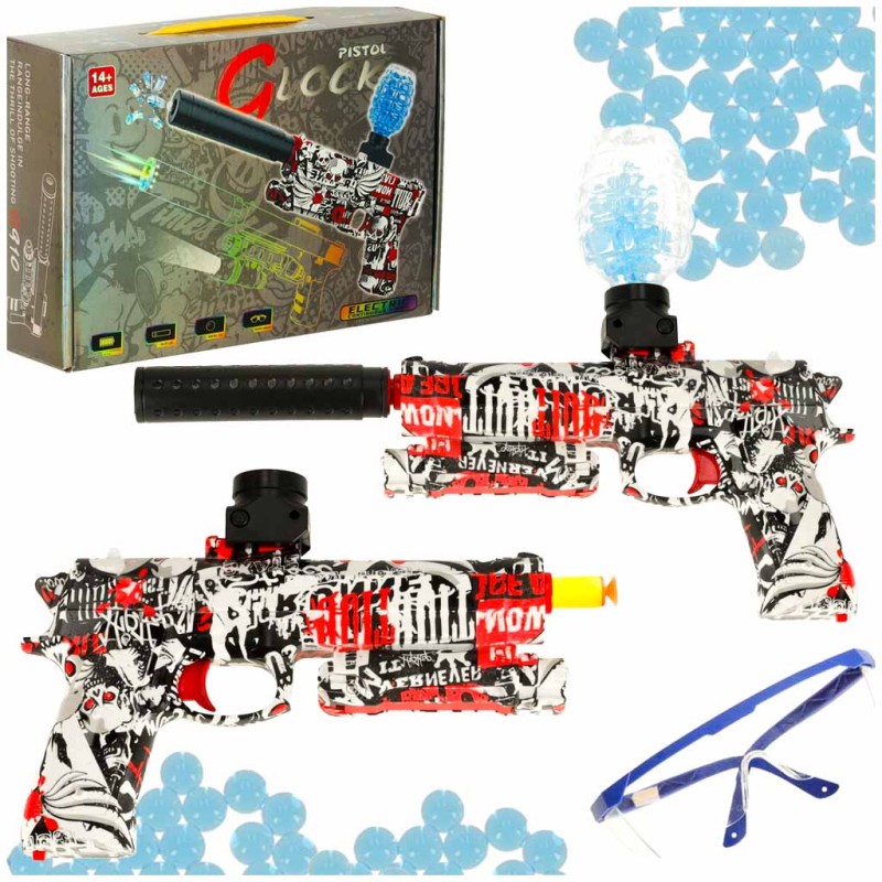 Elektryczny pistolet do zabawy. Strzela dwoma rodzajami amunicji – nabojami piankowymi oraz kulkami hydrożelowymi. W zestawie opakowanie kulek do samodzielnego przygotowania – kulki należy zanurzyć w wodzie na 3-4 godziny, aż zwiększą swoją objętość.