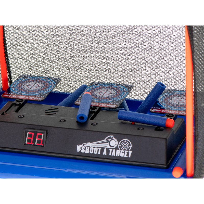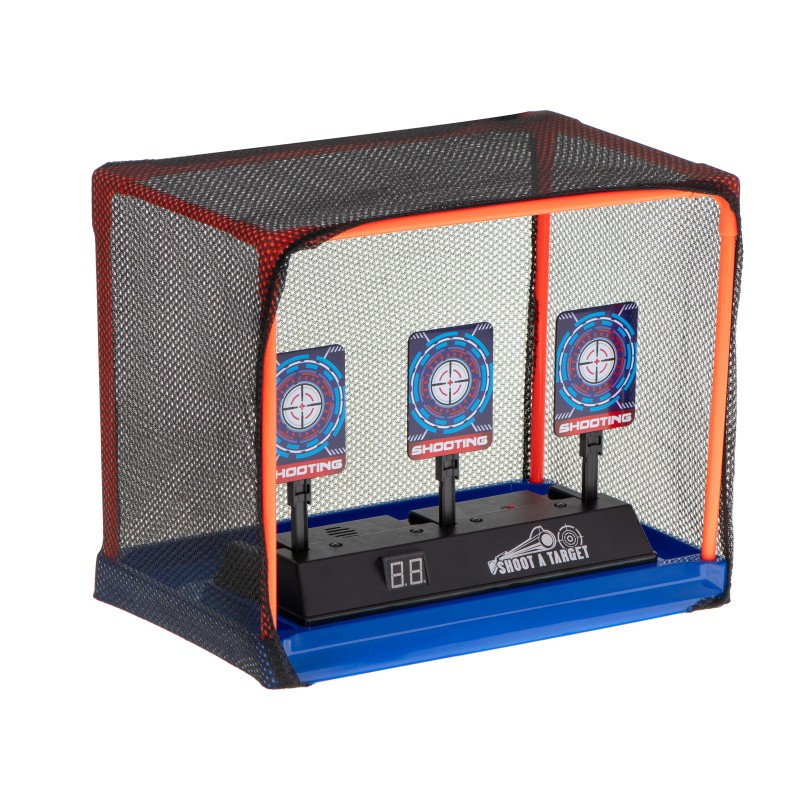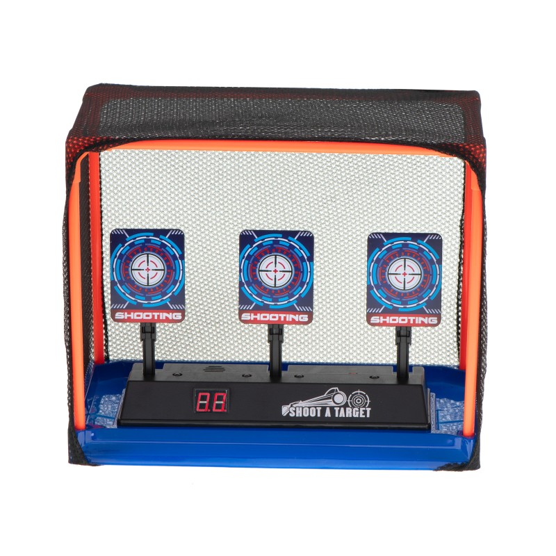 Elektroniczna potrójna tarcza do strzelania z cyfrowym wyświetlaczem. Pozwoli wyćwiczyć celność i precyzję strzału. Wyposażona w efekty świetlne i dźwiękowe. Zasilana na 3 baterie AA 1,5V (brak w zestawie). Tworzywo: plastik. Wymiary: 24,3x10x17cm.