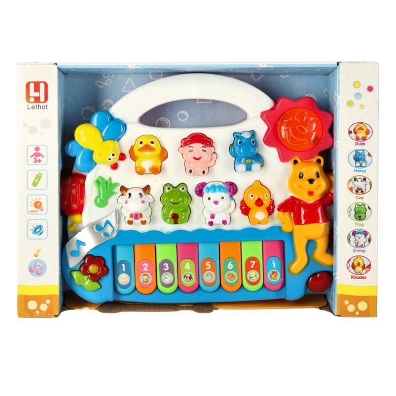 W zależności od wybranego trybu pianinko wygrywa gamę, melodyjki lub odgłosy zwierząt.