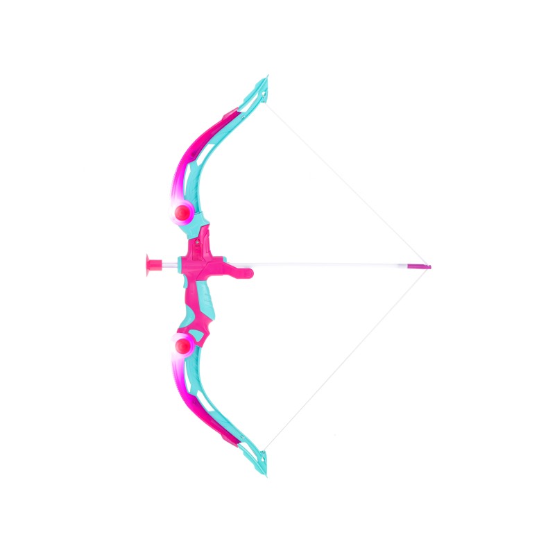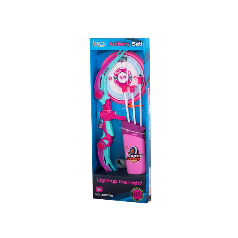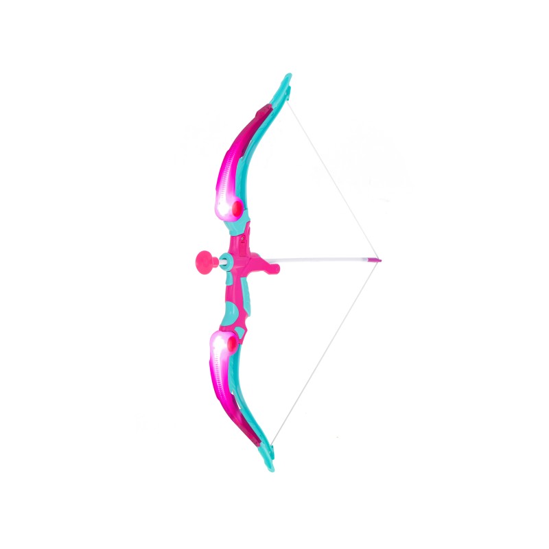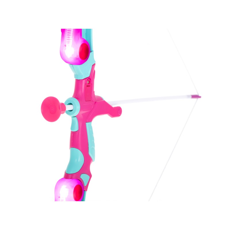Zestaw strzelecki – łuk ze strzałkami i tarczą. Idealny dla małych wojowników i fanów Indian. W zestawie: tarcza, łuk, kołczan ze strzałami, 3 strzałki z przyssawkami. Kolor: różowy. Zasilanie: 3x AG13 (w zestawie). Śr. tarczy: 20cm. Dł. łuku: 53cm.