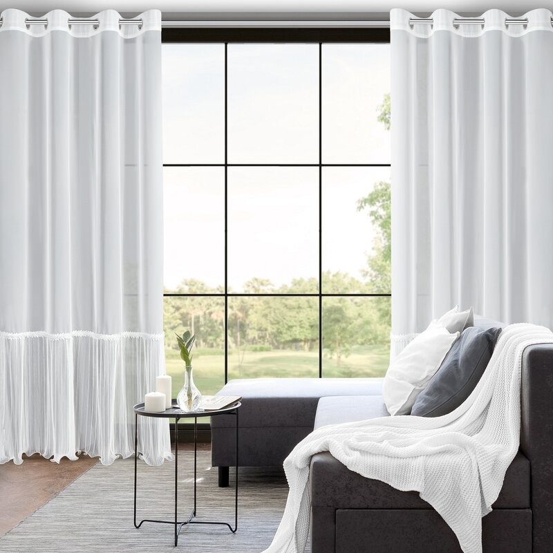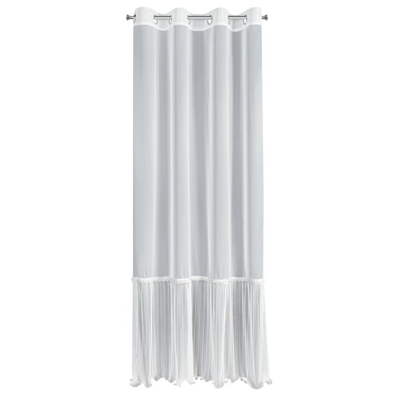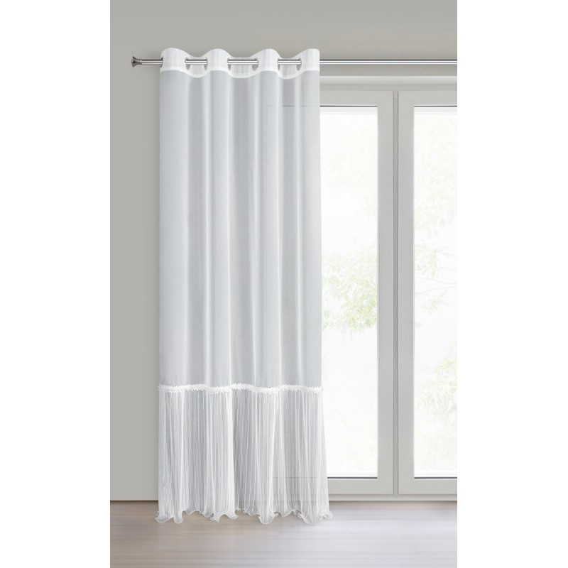 Dolna część firany zdobiona jest gęstym, pionowym plisowaniem, które dodaje jej lekkości i wyrafinowanego charakteru. Ozdobna koronkowa lamówka w miejscu łączenia tkanin tworzy finezyjny detal, który doskonale wpisuje się w estetykę wnętrz w stylu glamour, klasycznym lub romantycznym.