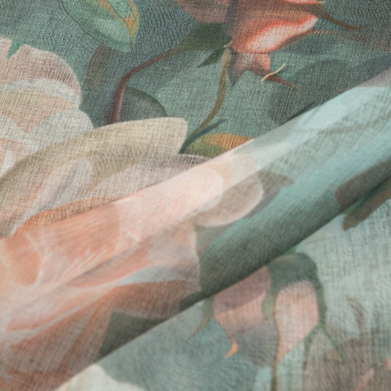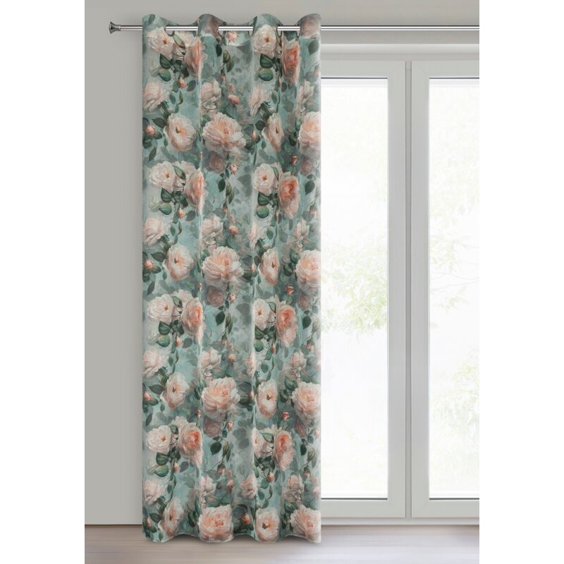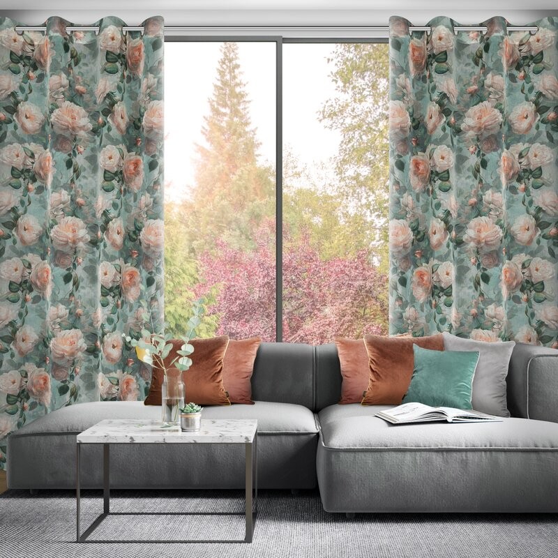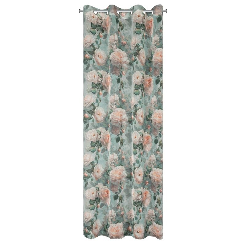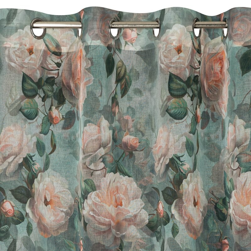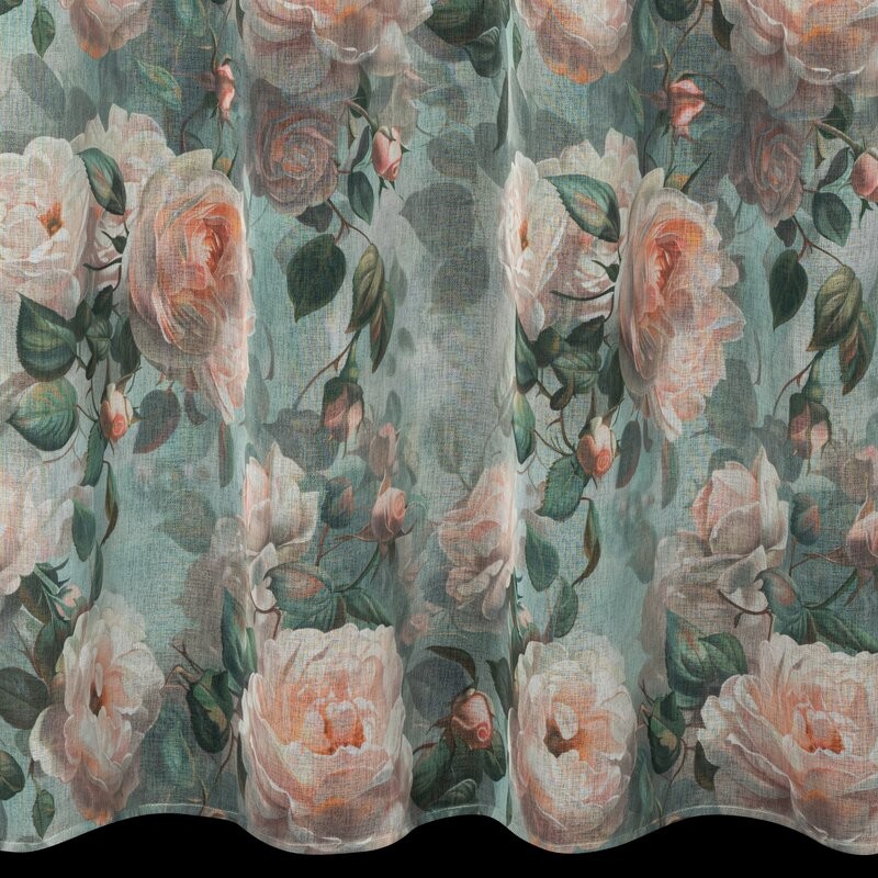 Wprowadź do swojego wnętrza romantyczny i świeży akcent dzięki zwiewnej zasłonie uszytej z matowej etaminy, ozdobionej delikatnym nadrukiem różowych róż na subtelnym miętowym tle. Lekka i półprzezroczysta tkanina pięknie przepuszcza światło, nadając pomieszczeniu jasność i lekkość.