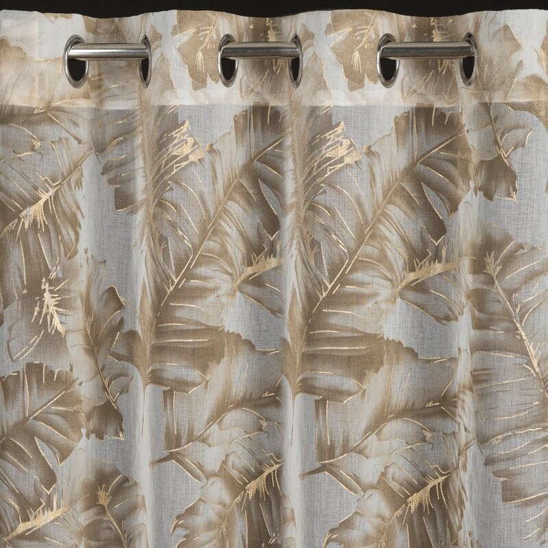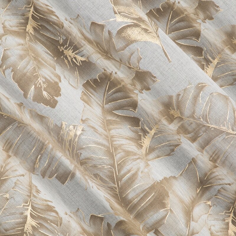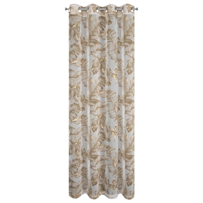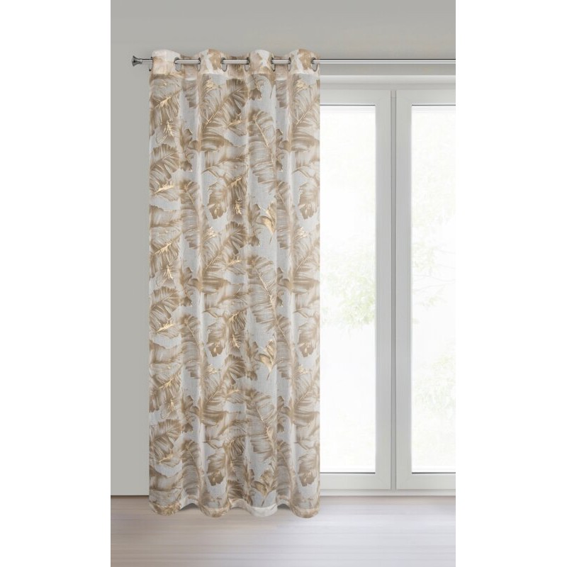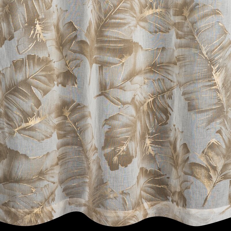 Stylowa zasłona uszyta z lekkiej, półprzeźroczystej etaminy o melanżowej strukturze, która nadaje tkaninie subtelnej głębi i naturalnego charakteru. Jej powierzchnię zdobi wzór beżowych liści na białym tle, uzupełniony złotymi, błyszczącymi akcentami, dodającymi wnętrzu elegancji i delikatnego blasku. Dzięki metalowym przelotkom montaż jest szybki i wygodny, a zasłona efektownie układa się w miękkie, naturalne fale.