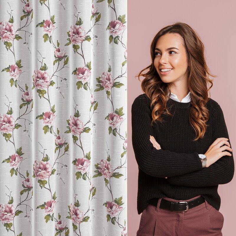 Delikatna zasłona z etaminy o wyraźnym splocie, zdobiona nadrukiem pnących się kwiatów na białym tle. Lekka i zwiewna tkanina przepuszcza światło, tworząc przyjemną, jasną atmosferę w pomieszczeniu. Zasłona wyposażona w przelotki, co ułatwia szybkie i wygodne zawieszenie, a materiał pięknie układa się w eleganckie fale. Idealna do salonu, sypialni czy jadalni, wprowadzając do wnętrza lekkość i świeżość.