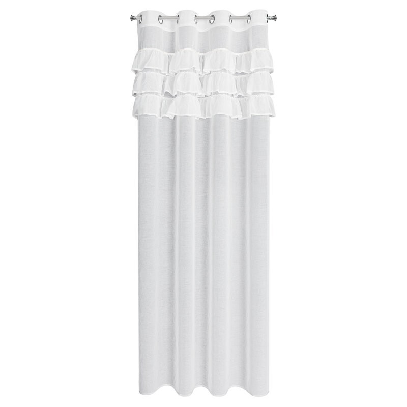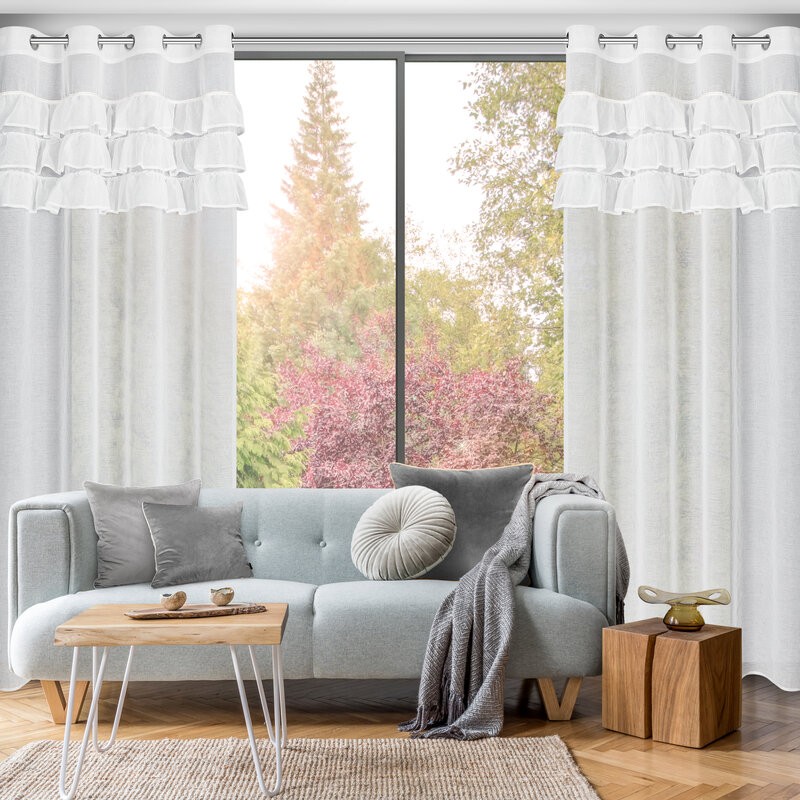 Gotowa firana SAMI z etaminy to lekka i delikatna dekoracja okienna, która wprowadza do wnętrza subtelny, naturalny urok. Zdobiona falbanami w górnej części, dodaje wnętrzu romantycznego i eleganckiego akcentu, przyciągając wzrok i nadając firanie wyjątkowego charakteru. Przewiewna struktura etaminy zapewnia doskonały przepływ światła, rozświetlając pomieszczenie i tworząc przytulną atmosferę. Firana doskonale sprawdzi się w sypialniach, salonach czy jadalniach, dodając im lekkości i stylu. To idealny wybór dla osób, które poszukują połączenia prostoty z ozdobnym wykończeniem. Praktyczne przelotki, zamocowane w górnej części zasłony zapewniają szybką i bezproblemową zmianę dekoracji, ponadto dzięki nim zasłony układają się w miękkie fale.