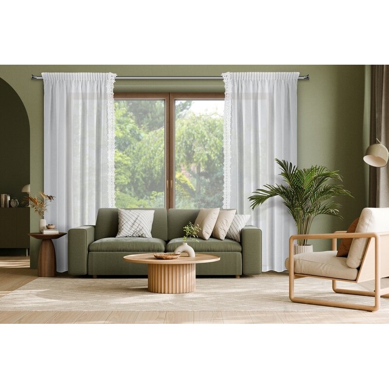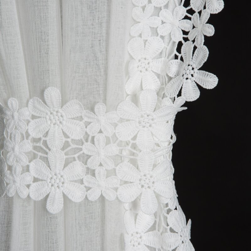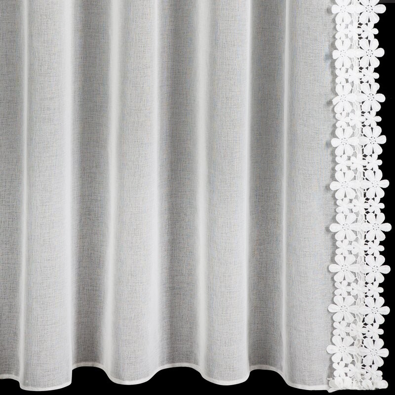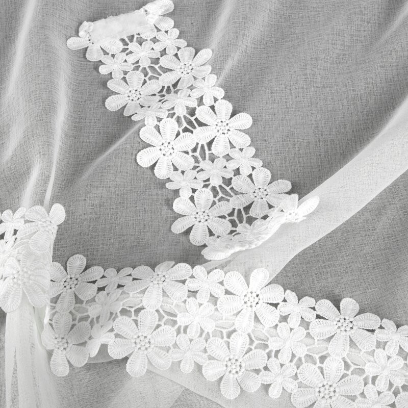 Obie firany zostały ozdobione ażurową aplikacją z drobnymi kwiatuszkami wzdłuż brzegów tkaniny, co dodaje im dekoracyjnego, subtelnego charakteru. To idealna propozycja do salonu, sypialni, jadalni czy pokoju dziecięcego.