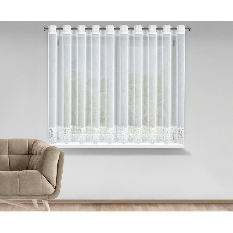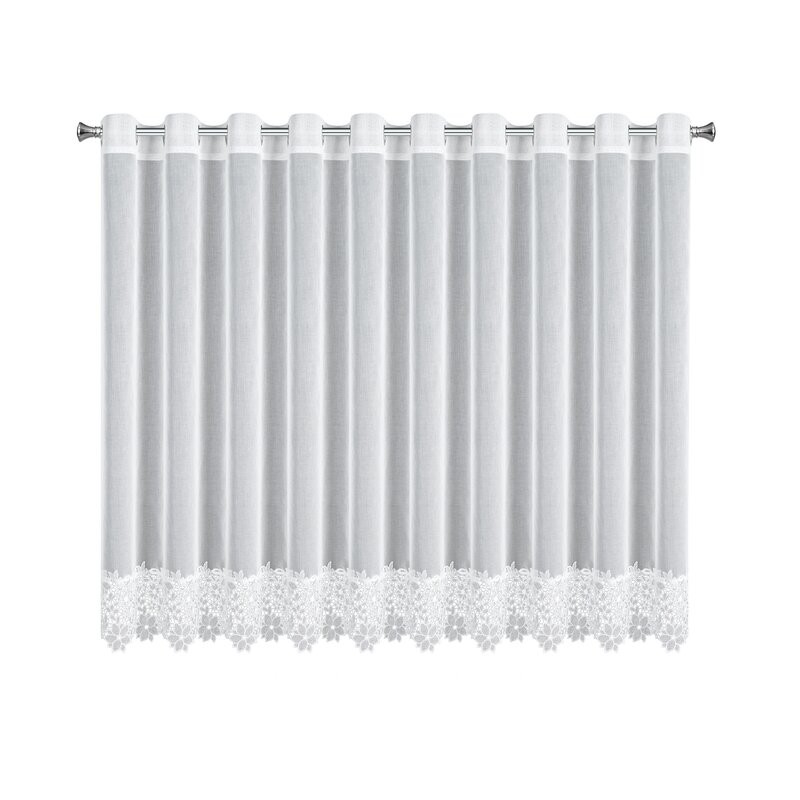 Firana gotowa zdobiona kwiatowymi aplikacjami oraz falbaną u dołu szerokość: 140 cm, długość: 270 cm, kolor: biały, Gramatura: 50 GSM, Skład: 100% poliester