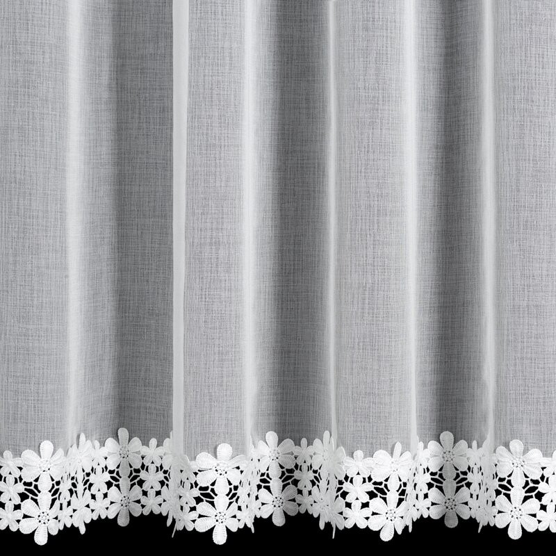 Firana gotowa zdobiona kwiatowymi aplikacjami oraz falbaną u dołu szerokość: 140 cm, długość: 270 cm, kolor: biały, Gramatura: 50 GSM, Skład: 100% poliester
