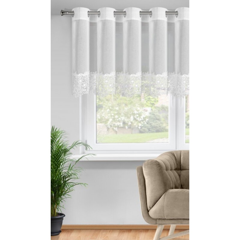 Firana gotowa zdobiona obszywką szerokość: 200 cm, długość: 70 cm, kolor: biały, Gramatura: 70 GSM, Skład: 100% poliester